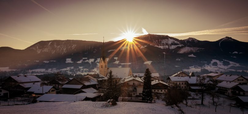 Dem Charakter der vorweihnachtlichen Adventwochen entsprechend tauchte in diesen Tagen das Morgenlicht der Sonne auf dem Samerberg auf: leise und mit klaren, Hoffnung spendenden Farben. Ein besonders froher Blick ergibt sich dabei oberhalb von Törwang mit Blick über die Pfarrkirche „Maria Himmelfahrt“ hinüber zur Hochries.