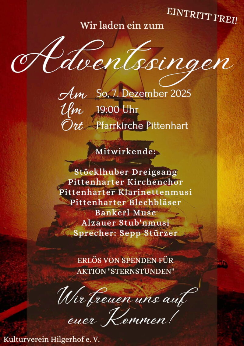 Der Kulturverein Hilgerhof e.V. lädt am Sonntag, den 07. Dezember 2025 um 19.00 Uhr zum Adventsingen in der Pfarrkirche Pittenhart ein. Mitwirkende des stimmungsvollen Abends sind der Stöcklhuber Dreigesang, der Pittenharter Kirchenchor, die Pittenharter Klarinettenmusik, die Pittenharter Blechbläser, die Bankerl Muse und die Alzauer Stub’nmusi. Sepp Stürzer führt als Sprecher durch den Abend.