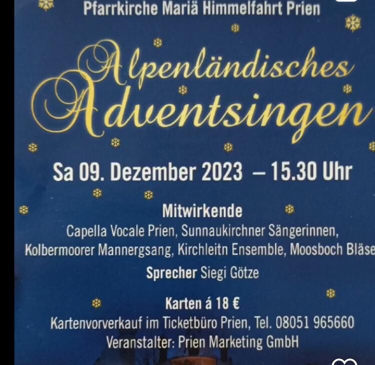 Am vergangenen Samstag konnte in der Pfarrkirche Mariä Himmelfahrt in Prien am Chiemsee wieder das Alpenländisches Adventsingen stattfinden. Zur musikalischen Gestaltung wurden im Auftrag der Prien Marketing GmbH namhafte Volksmusik- und Gesangsgruppen eingeladen.
