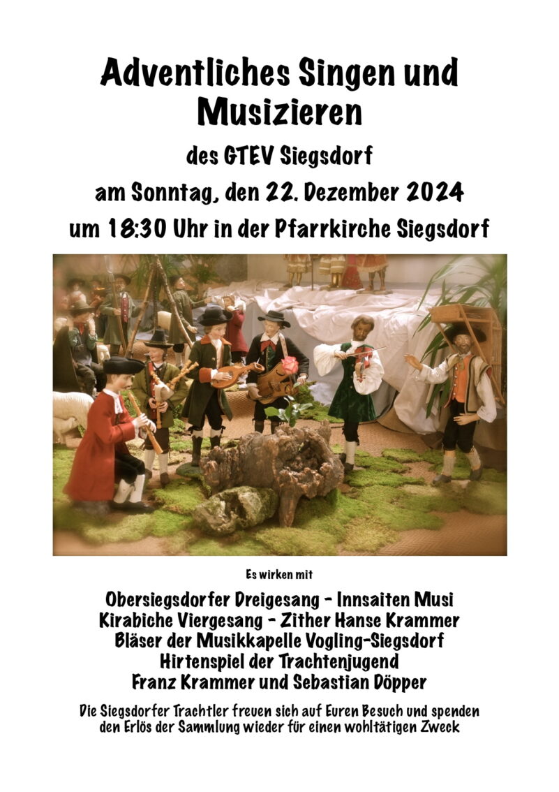 Adventliches Singen und Musizieren des GTEV Siegsdorf am Sonntag den 22. Dez. um 18.30 Uhr in der Pfarrkirche SiegsdorfSeit 33 Jahren veranstaltet der GTEV Siegsdorf jährlich sein Adventliches Singen und Musizieren und stellt den Erlös der Sammlung am Schluss karitativen Zwecken oder familiären Notfällen zur Verfügung.