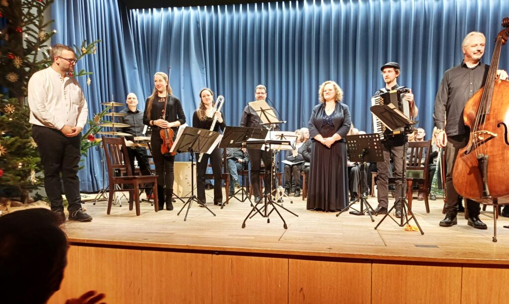 All das brachte Patrick Pföß bei der Uraufführung seines neu komponierten Stückes „Letzte Nacht“ atmosphärisch wunderbar zum Ausdruck – ein Höhepunkt der Veranstaltung. Die Zuhörer lauschten gebannt, den ungewohnten Klängen – ganz anders als zuvor die volksmusikalischen – produziert von einem kleinen Orchester: die Sängerin und Schauspielerin Christine Mittermair mit volltönender Altstimme, Johanna Hartmann auf der Bassflöte, Tamás Ferge mit der Bassklarinette, Marinus Weidinger, Akkordeon, Anno Kesting, Perkussion, Constanze Germann-Bauer, Violine und Claus Freudenstein auf dem Kontrabass. Alle konnten offenbar die furchtsame Erwartung spüren, was wohl in einer der Rauhnächte geschehen könnte, die vage Hoffnung, aber auch den Schrecken und die Angst vor den Geistern, die wohl die Macht zur ewigen Verdammnis hatten.