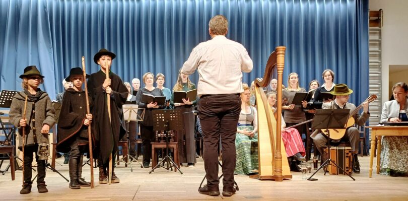 Abwechslungsreich und musikalisch sehr schön sangen und spielten der Projektchor unter Leitung von Patrick Pföß, sowie einzelne Ensembles und Instrumentalgruppen der Adlgasser Sing- und Musikschule. Glockenhell, perfekt einstudiert und absolut harmonisch aufeinander abgestimmt sang der Chor a capella und vielstimmig. Herzerwärmend war dazwischen immer wieder der Auftritt der drei jungen Klöpfler mit Hüten, Stöcken und Umhängen angetan, die mit klaren Stimmen sangen oder Wichtiges ankündigten.