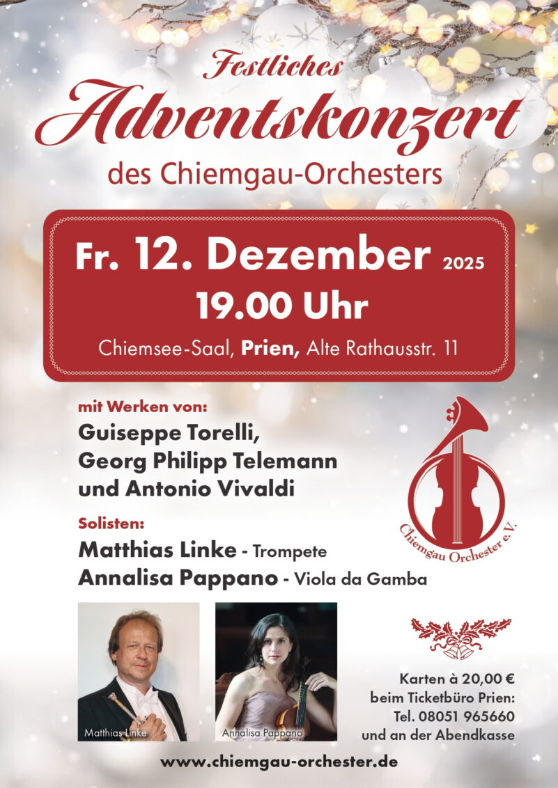 Der Leiter des Orchesters, Matthias Linke, wird wie letztes Jahr nicht nur als Dirigent, sondern auch als Solotrompeter auftreten und das schwungvolle Trompetenkonzert in D-Dur von Giuseppe Torelli zur Aufführung bringen. Einen weiteren Höhepunkt des Abends bildet die wunderschöne Orchestersuite für Viola da Gamba von Georg Philipp Telemann, interpretiert von der international bekannten Solistin Annalisa Pappano. Außerdem stehen zwei Orchesterwerke auf dem Programm: Antonio Vivaldis Triosonate ‚La Follia‘ in d-moll in der Fassung für Streichorchester und Viola da Gamba – dieses Werk, aus 20 Variationen des berühmten Follia-Themas bestehend, wird vom Orchester abwechselnd solistisch und in Tutti-Besetzung gespielt. Außerdem erklingt das feierliche Weihnachtskonzert op. 8,6 von Guiseppe Torelli. Karten gibt es im Vorverkauf im Ticketbüro der Tourist-Info Prien und an der Abendkasse.