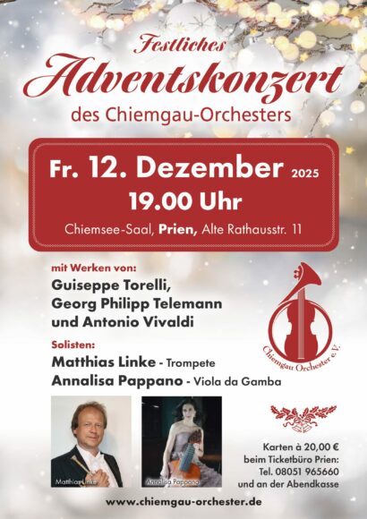 Wie jedes Jahr veranstaltet das Chiemgau-Orchester auch heuer wieder sein nun schon zur Tradition gewordenes festliches Adventskonzert. Es findet am Freitag, dem 12. Dezember um 19.00 Uhr im Chiemsee-Saal in Prien in kammermusikalischer Besetzung statt.