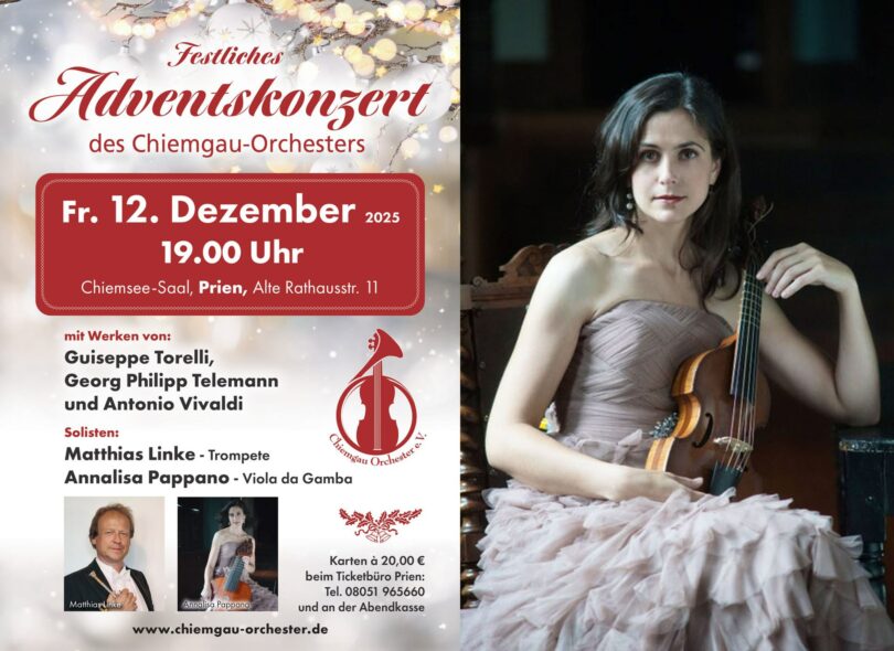 Auf dem Programm stehen unter anderem das Konzert für Trompete und Orchester von Guiseppe Torelli – mit dem musikalischen Leiter des Chiemgau-Orchesters, Matthias Linke, als Solisten -, Torellis Weihnachtskonzert sowie „La Follia“ von Antonio Vivaldi. Als Höhepunkt des Abends erwartet das Publikum die Ouvertüre für Viola da Gamba und Orchester von Georg Philipp Telemann mit der international gefeierten Solistin Annalisa Pappano. Karten sind im Vorverkauf erhältlich im Ticketbüro Prien (08051/965660), online über ticketservice@tourismus-prien oder an der Abendkasse.