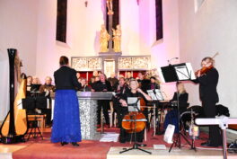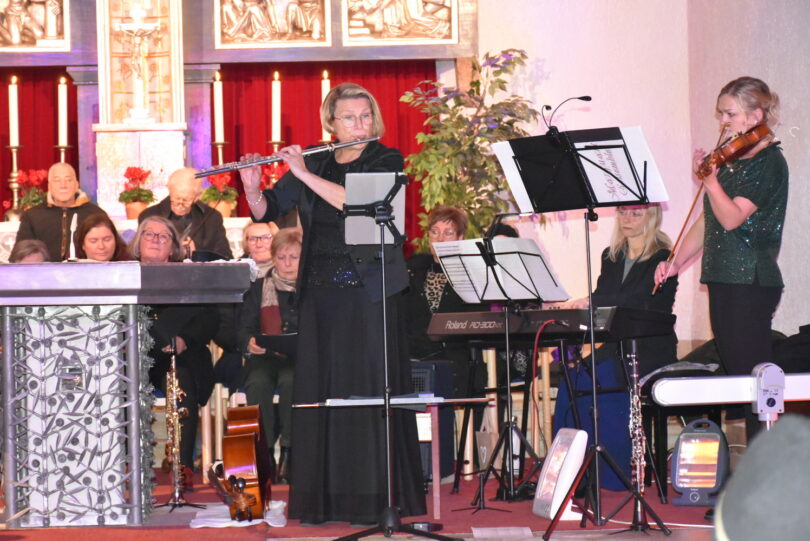 Der französische Komponist Jacques Ibert hat ein virtuoses Stück für Flöte (Corinna Halder), Violine (Luisa-Maria Halder) und Klavier (Dominika Schmidt) geschrieben, das von den Marquartsteiner Musikerinnen wunderbar gespielt wurde. Ihr Können an der Harfe zeigte Alexandra Scheufler mit Luisa-Maria Halder mit der Violine bei dem Stück von dem bekannten Filmmusikkomponisten Nicola Piovani mit „Buongiorno Principessa. Bei dem Arrangement von Wolfgang Amadeus Mozart „Brennende Lichter“ waren fast alle Musiker beteiligt, dazu Stefan Hildebrand mit dem F-Horn. So wurden noch viele Stücke ohne Pause gespielt, unterbrochen von den kleinen Geschichten von Sprecherin Claudia Kraus. Sie regten zum Schmunzeln und Nachdenken an, besonders über die kommende Advents- und Weihnachtszeit, zum Beispiel über „Perfektion unterm Weihnachtsbaum“ oder von Ephraim Kishon „Was wir uns schenken“.