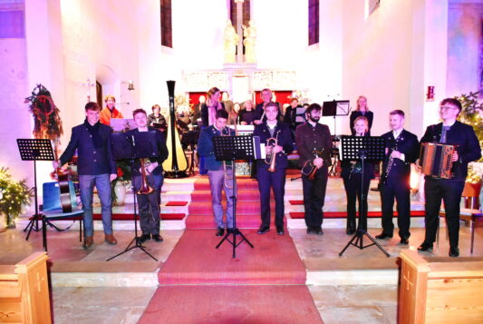 Bürgermeister Andreas Scheck begrüßte die vielen Gäste und empfahl, die Zeit in der Kirche zu nutzen, um runterzukommen für die stade Zeit. Für das Konzert wurde einiges an Musikanten aufgeboten und ein abwechslungsreiches Programm zu Gehör gebracht. Die Gruppe „Zwecks da Musi“ eröffnete stimmungsvoll mit ihren Blasinstrumenten von der Empore mit „Trog mi Wind“. Beeindruckend ging es weiter mit den Stimmen des Kirchenchors Oberwössen unter der Leitung von Alexandra Scheufler, Dominika Schmidt am Klavier, Corinna Halder am Cello und Luisa- Maria Halder mit der Violine mit dem bekannten Adventslied „Tochter Zion“.