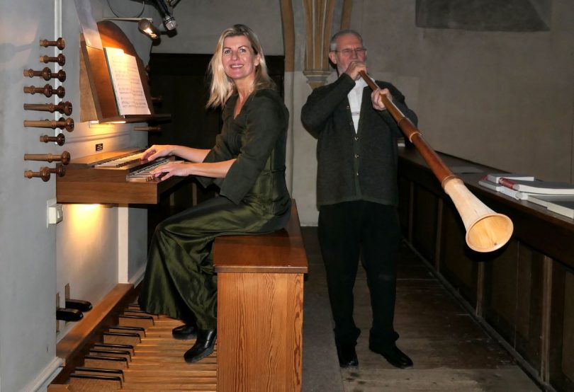 Dazwischen gab es einzigartige Musikstücke mit Gemshorn und Serpent von Franz Schüssele. Ein musikalischer Kunstgenuss waren auch die weihnachtlichen Gesangsbeiträge des Chiemgauer Zwoagsangs mit Andrea Wittmann am Akkordeon. Die Sinfonia Pastorella von Leopold Mozart für Hirtenhorn und Orgel, gespielt von Franz Schüssele und Andrea Wittmann, waren der Höhepunkt des Konzerts. Traditionell endete das Adventskonzert mit dem “Andachtsjodler”, gemeinsam gesungen mit dem Publikum.