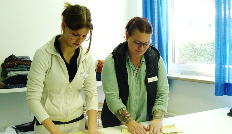 Bericht und Foto: AELF Rosenheim – Mirijam Rappel mit Ausbilderin Kathrin Ebersberger (v. l.) beim Legen der Wäsche im Caritasheim St. Josef in Prien