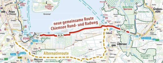 Ab sofort führt der Chiemsee Rund- und Radweg ab der Gemeindegrenze Übersee, von Grabenstätt kommend, entlang der Autobahn bis nach Bernau – Felden und schließt dort wieder an den bestehenden Chiemsee Rund- und Radweg an. Vereinfacht ausgedrückt: Die neue Route verläuft auf der bisherigen Alternativroute und die bisherige Route wird mit leichten Änderungen zur Alternativroute. Der Kartenausschnitt zeigt die neue Wegführung.