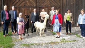 Preisverleihung an Familie Schreiner mit Begleitung: v. li. Hermann Etzel (BBV-Kreisobmann), Gerhard Stadler (BBV-Bezirkspräsident) , Cilly Moser, Ludwig Reil (Direktvermarkter), Regina Westenthanner (Heimatunternehmen Niederbayern), Sepp Kellerer (Landwirtschaftliches Wochenblatt), Elisabeth Schreiner (Betriebsleiterin), Paula Hochholzer (BBV-Kreisbäuerin), Irene Waas (BBV-Bezirksbäuerin). (c) BBV