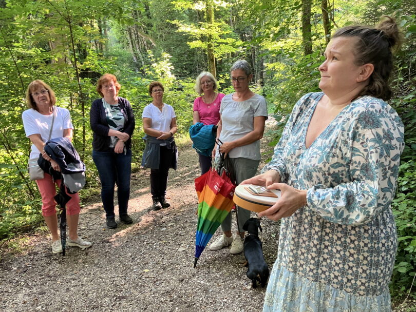 Die Märchenfreunde hatten Glück, denn fast pünktlich zur Erzählwanderung hinauf zur Kugelmühle hörte es auf zu regnen. Steffi Schönlinner, die in Ainring geboren ist und nun in Tittmoning lebt, erzählte den Kindern und Erwachsenen Geschichten, von denen alle etwas hatten, denn es gab immer auch eine versteckte Botschaft, über die die Großen nachdenken konnten, während die Kinder noch mit der spannenden Handlung gedanklich beschäftigt waren.