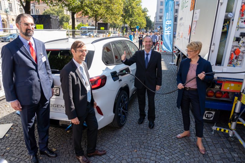 Im Rahmen der IAA hat das Bayerische Wirtschaftsministerium vor dem Gebäude an der Prinzregentenstraße eine mobile Wasserstoff-Tankstelle installiert. Gemeinsam mit Vertretern der Automobilhersteller BMW und Hyundai hat Wirtschaftsminister Aiwanger die Anlage in Betrieb genommen und mehrere Fahrzeuge aufgetankt. Bis zum Ende der IAA am 12. September finden hier jeden Tag um 11.00, 13.00 und 15.00 Uhr Tankdemonstrationen und Probemitfahrten statt. Nähere Infos dazu erhalten Sie hier.