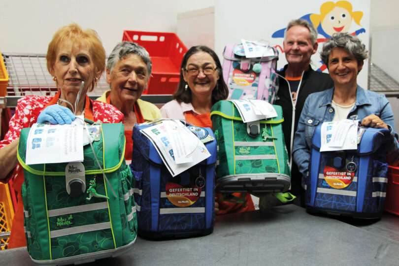 Bericht und Bild: Aktion Aufwind/ Sparkassenstiftungen Zukunft – www.sparkassenstiftung-zukunft.de – Andrea Janshen von den Sparkassenstiftungen Zukunft (re.) beim Besuch der Rosenheimer Tafel: Die ehrenamtlichen Mitarbeiterinnen und Mitarbeiter geben die Schulranzen, die die Aktion Aufwind angeschafft hat, an die Familien aus.