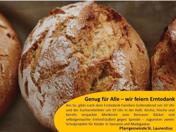 Die Gemeinde Bernau informiert: Auch heuer organisieren die Ministranten und der Pfarrgemeinderat wieder die Aktion Minibrot. Nach den Erntedank-Gottesdiensten um 10 Uhr (Familien-Gottesdienst mit den Hafenstoaner Alphornbläsern) und um 19 Uhr (Eucharistiefeier mit feierl. Orgelmusik) werden wieder die kleinen Brote, zusammen mit selbstgebundenen Erntesträußerln gegen eine großzügige Spende verteilt.  Der Erlös ist in diesem Jahr für Schulprojekte in Tansania (Marafiki wa Afrika e.V.) und Madagaskar (Bildung für Madagaskar e.V.) bestimmt. Bitte berücksichtigen Sie diese Aktion bei Ihren Wochenendeinkäufen und bereits jetzt ein Herzliches Vergelts Gott für Ihre Spende!