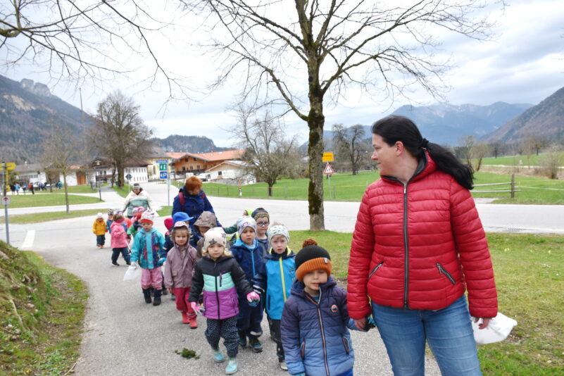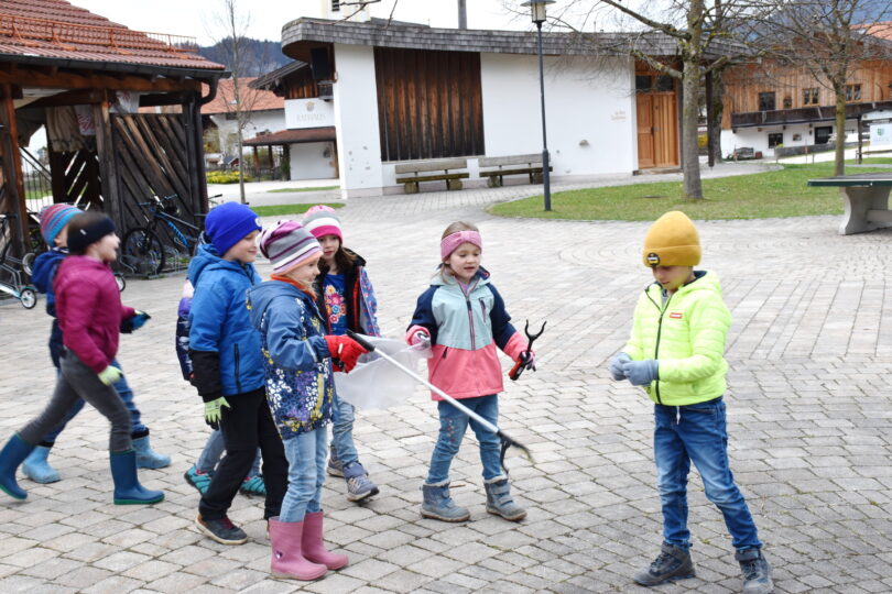 Vom Dorfplatz aus strömten die Kinder in alle Richtungen mit den Müllsäcken, Greifzangen und Handschuhen, um bei der „Aktion Saubere Landschaft“ ihren Einsatz zu bringen. Die Jüngsten aus dem Kindergarten waren mit der Mission „Tiere retten“ unterwegs und der Idee, damit die Tiere keinen Unrat fressen, sammeln wir ihn auf. Die Waldkindergarten-Kinder waren fleißig und aktiv in Sachen „Wald aufräumen“ draußen.