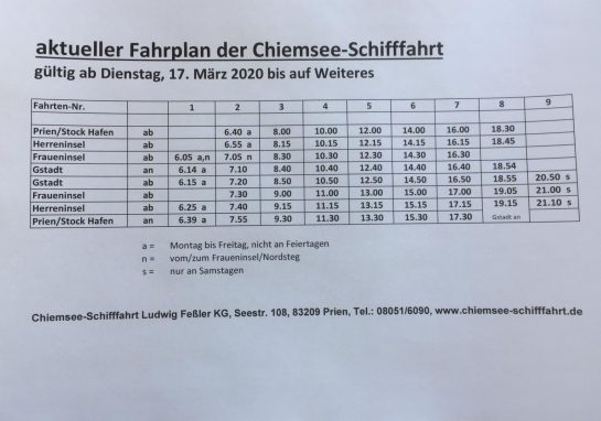 Aus gegebenem Anlass wird ab Dienstag, 17. März, der Fahrplan auf dem Chiemsee von Prien und Gstadt zur Herren- und Fraueninsel auf einen 2 stündigen Rhythmus reduziert. Die Fahrten dienen dazu, die Versorgung der Inselbewohner aufrecht zu erhalten.