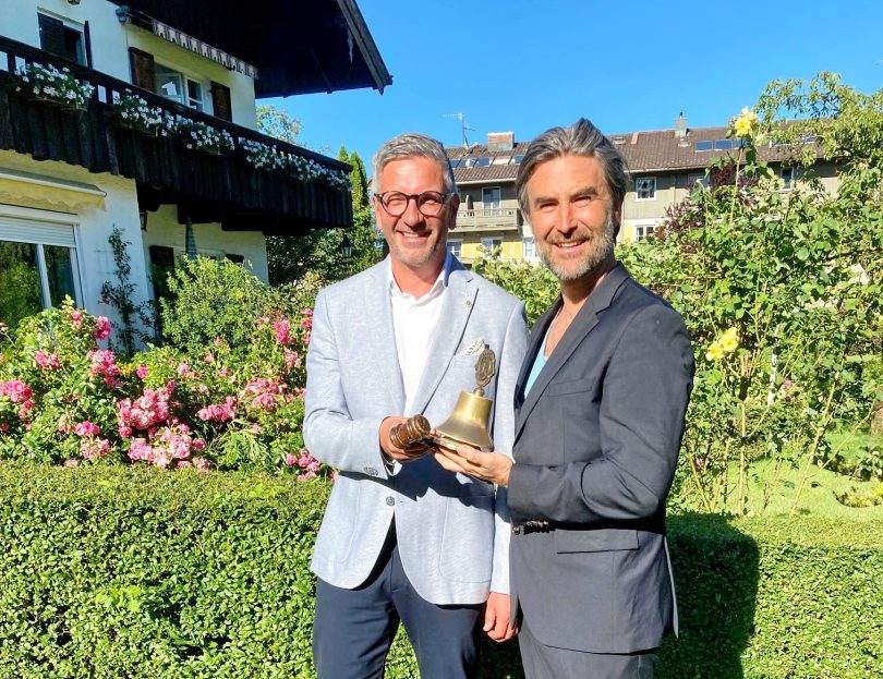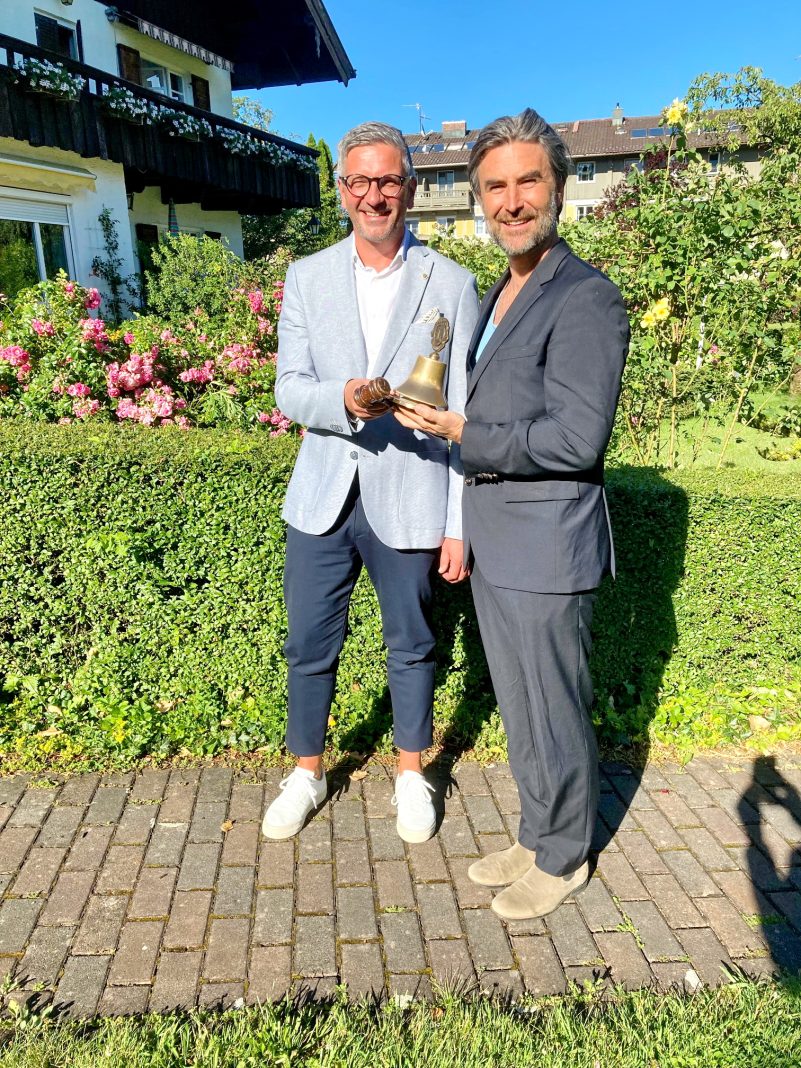 Bericht und Foto: Sepp Resch, Lions-Club Prien a. Chiemsee – Glockenübergabe von Dr. Alexander Simon an Alexander Hagenbrock (li.)