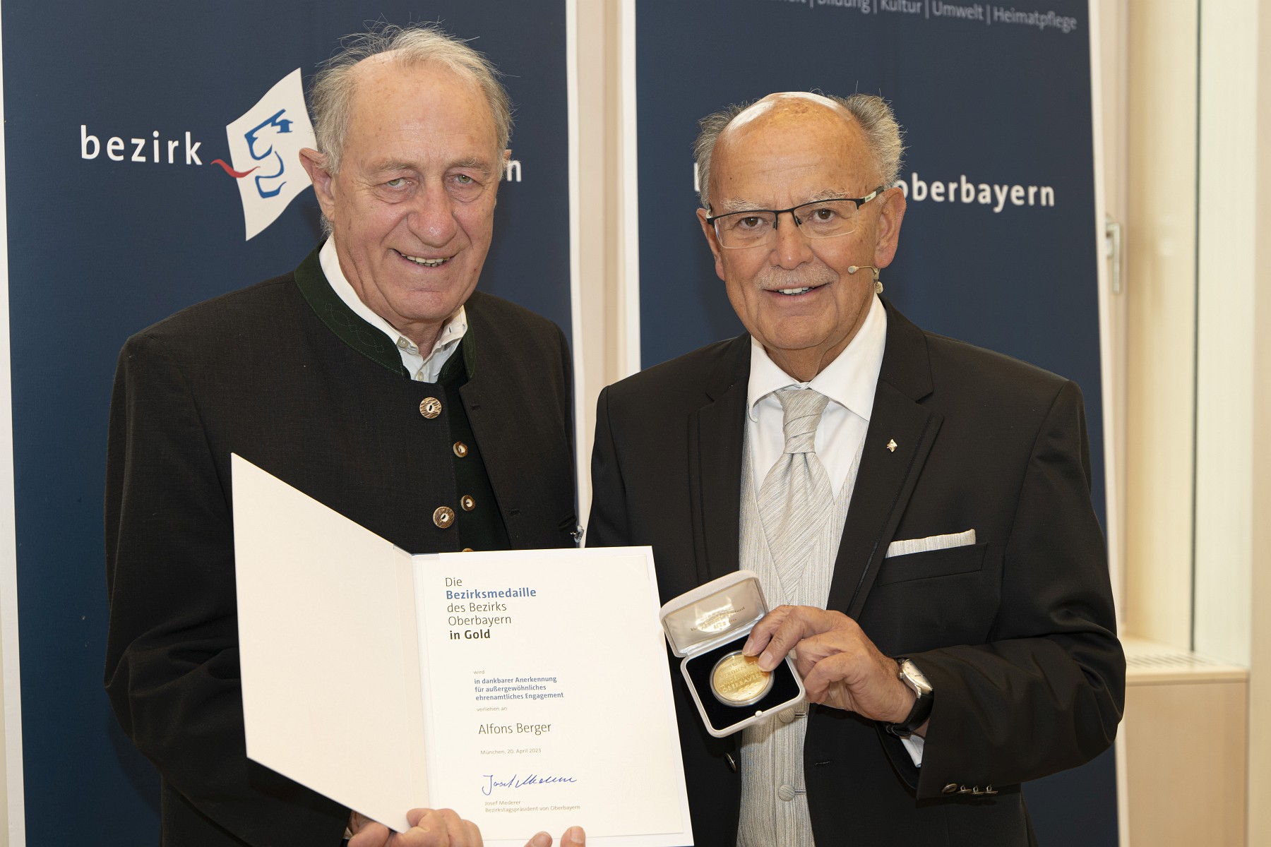 Bezirkstagspräsident Josef Mederer (rechts) verleiht die Bezirksmedaille an Alfons Berger.