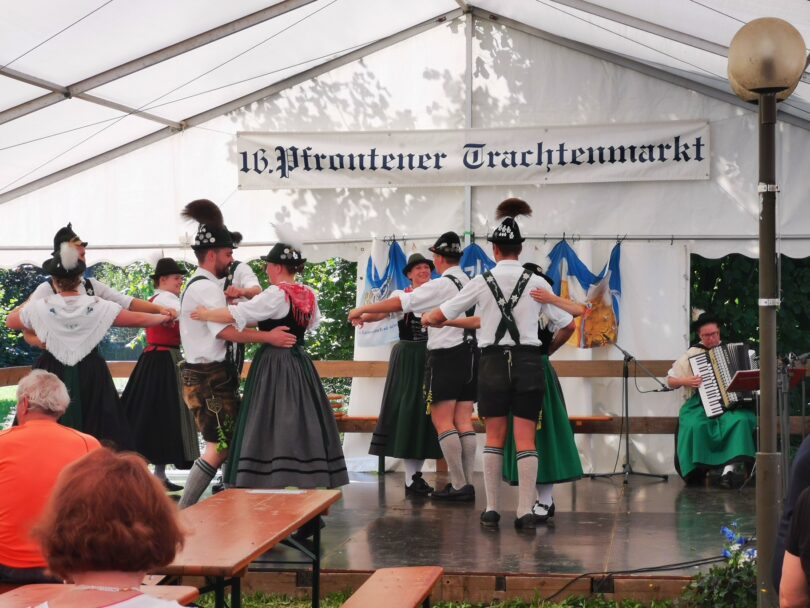 Nach erfolgreichen 16 Jahren kann man beim Pfrontner Trachtenmarkt im Allgäu schon von einer Institution sprechen. Und auch die Gaugruppe des Allgäuer Gauverbandes ist dort schon oft zu sehen gewesen. So füllten auch dieses Jahr vier Paare wieder die kleine Bühne im Zelt, um Feriengästen und Trachtlern einige Plattler zu zeigen.