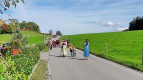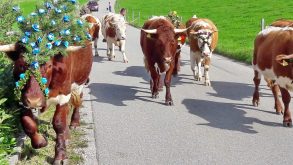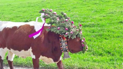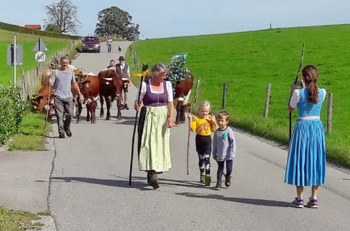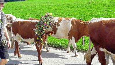 Genau zum richtigen Zeitpunkt am richtigen Ort war der Samerberger Fotograf Jörg Schäfer als er von Grainbach nach Frasdorf fuhr und in der Ortschaft Ruckerting auf eine kleine Herde von Almvieh traf. Als Zeichen der Dankbarkeit wurden die Tiere schön geschmückt – wie diese Aufnahmen zeigen.