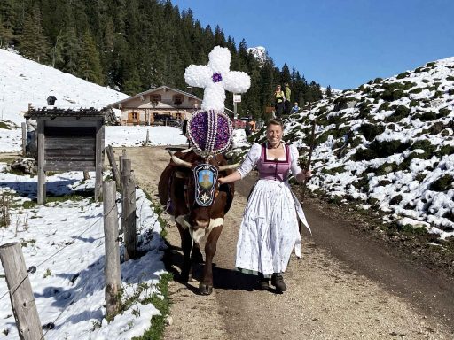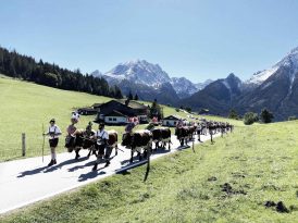 Kälber von der Mordaualm in der Ramsau am vergangenen Sonntag traditionell „aufkranzt“ – also mit Fuikl und Glocken geschmückt. Von der rund 1200 Meter hoch gelegenen Mordaualm ging es bei strahlendem Sonnenschein und schneebedeckten Gipfeln in dreieinhalb Stunden erst hinunter zur Deutschen Alpenstraße, dann hinauf aufs Hochschwarzeck und wieder hinunter nach Bischofswiesen.