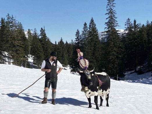 Wenn die Kühe mit den Kronen geschmückt sind, warten die rangniederen Tiere einzeln bewacht von den Treibern, bis es heimwärts geht.