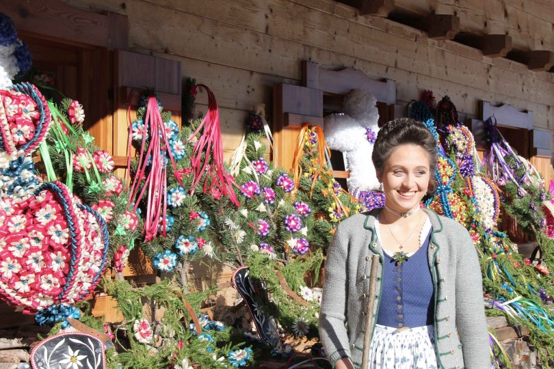 Zwischen 30 und 40 Stunden braucht es, bis die großen Fuikl – der Almschmuck für den Abtrieb – fertig ist. Begonnen wird dazu traditionell am 24. August, zu Bartholomä. Mitgeholfen haben dabei die ganze Bergbauern-Familie, dieses Jahr jedoch besonders Sohn Franz! Mit im Bild: Tochter Katharina Koller.