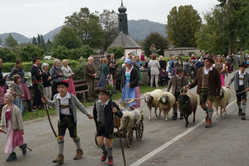 Im Anschluss an die heilige Messe, in der auch all der letztjährig verstorbenen Mitglieder des Almwirtschaftlichen Vereins gedacht wurde, machte sich der Festzug durch den Ort, über die Staatstraße, entlang des Friedhofs, hinüber zum Festzelt auf den Weg. Gut, dass es eine lange Strecke war, denn was da alles geboten wurde, brauchte viel Platz: Musikkapellen, Gebirgsschützen, Trachtenvereine mit ihren jungen und älteren Teilnehmern, Feuerwehrler, Schalkfrauen und natürlich die Almleute, Almbauern und Ehrengäste selbst. Dazu noch das ganze Viehzeug von Hennen auf Karren und Kraxen über geschmückte Schafe, aufgekranzte Almkühe, geschmückte Kälber bis hin zum Rennesel, war alles vertreten. Kutschpferde und Berittene rundeten das Bild ab und dazu immer der Blick auf den Petersberg mit seinem weit ins Inntal hinunterleuchtenden Wallfahrtskircherl – ja, bei uns ist´s einfach wunderschön.