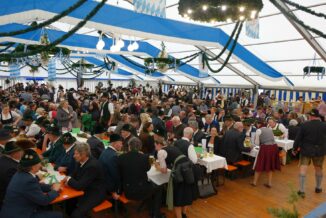 Dem Gemeindeoberhaupt Stefan Lederwascher stand die Freude über die erfolgreiche Tatkraft seiner Leute ins Gesicht geschrieben, zeugt doch das Ziehen an einem Strang davon, dass die Dorfgemeinschaft hier noch funktioniert. Mangels ausreichend großer Räumlichkeiten wurde extra ein Zelt aufgestellt, auch die Bedienung und der Ausschank lagen in Händen der Veranstalter selbst. Dazu dann das übliche weitere Geschäft wie Kuchen backen, Zeltschmuck basteln und selbiges schmücken. Zum morgendlichen Standkonzert war die Musikkapelle Flintsbach frisch und munter im Einsatz, obwohl es beim vorabendlichen Heimatabend mit dem Heimgehen schon ein bisserl später geworden ist. Mit Märschen, Tuschs und Polkas begleiteten sie uns in voller Besetzung dann voll Freude und Elan den ganzen Tag auf der Bühne.