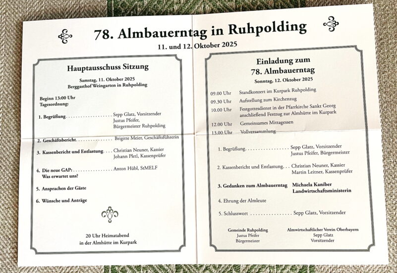 Das Samstags-Programm sieht die Hauptausschuss-Sitzung ab 13 Uhr im Berggasthof Weingarten sowie um 20 Uhr einen Heimatabend in der Almhütte im Kurpark vor. Am Sonntag, sind ab 9 Uhr ein Standkonzert im Kurpark, ein Festgottesdienst um 10 Uhr und um 13 Uhr die Vollversammlung angesetzt. Bei der Versammlung wird Bayerns Landwirtschaftsministerin Michaela Kaniber ein Grußwort sprechen (“Gedanken zum Almbauerntag”). Auch Ehrungen verdienstvoller Almleute sind vorgesehen.