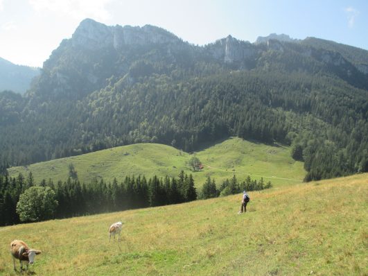 Von hier gehten wir auf bezeichnetem Weg bis zur Vockalm. Dann unmarkiert, aber ohne Probleme, auf Wegspuren über den Schwarzenberg und Erlbergkopf (Irlberg) mit sehr schönem Panorama auf Chiemsee und Chiemgauberge. Jetzt steigen wir frei über die Wiese hinunter zur Maureralm.