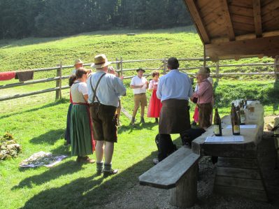 Unseren Durst sparen wir uns auf bis zur Herrenalm, wo wir nach einem kurzen Aufstieg mit schönen Ausblicken bis zur Lindlalm und gemütlichem Abstieg durch weitgehend freies Gelände , einkehren, Die Einkehr in der gemütlichen Alm dauert, denn es gibt nicht nur Bier und Brotzeit, sondern sogar “Programm”: eine Gruppe Jodler und ein Alphornbläser lassen uns länger als geplant verweilen.