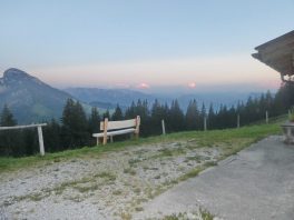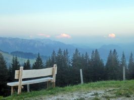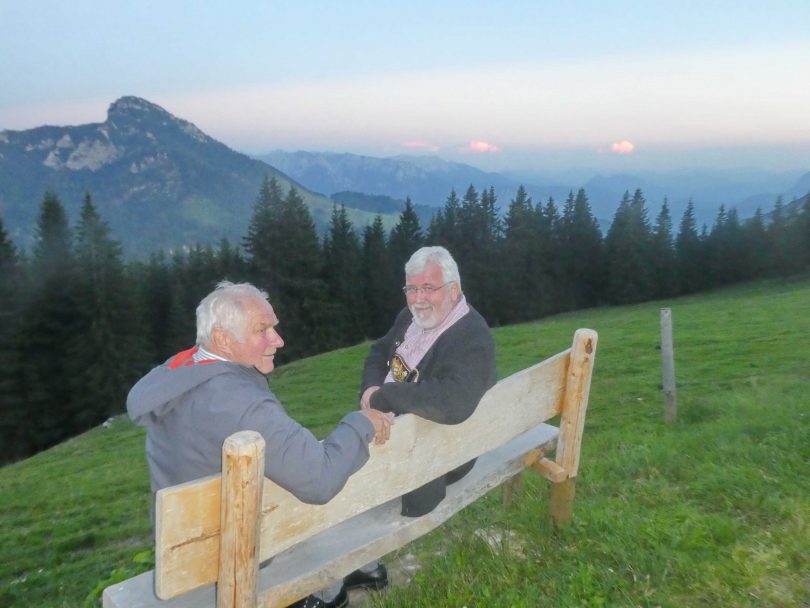 Fotos: Hötzelsperger – Abendstimmung auf der Feichteckalm – Hans Auer (li.) und Sebastian Friesinger auf der Bank mit Blick die Chiemgauer Bergwelt bei schönster Abendstimmung