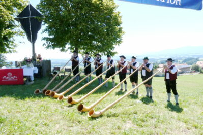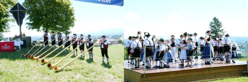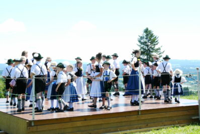 Mit einem feierlichen Feldgottesdienst, der musikalisch gestaltet wurde von einer kleinen Besetzung der Musikkapelle Bernbeuren, dem Zweigesang Bernbeuren und den Alphornbläsern aus Stötten & Bertoldshofen begann das Kreuzfest. In seiner Predigt ging Pfarrer Tadeusz Biernacki auf das Gwand ein – Kleider machen Leute und die Tracht ist ein Bekenntnis zur Heimat. Es schloss an der Almtag mit Mundartvorträgen von Martin Dorn, Martin Kreuzer und Sepp Wohlfahrt die ebenso von der Heimat erzählten. Für musikalische Unterhaltung sorgten mit ihren Musikstücken und Liedern die Senfchristallmusik, Klara und Franz, Johanna und Rafael aus Bernbeuren sowie die Marktoberdorfer Stubenmusik, die Alphornbläser aus Stötten & Bertoldshofen, die Schloßbergmusik aus Hopferau, die Frühnebelmusi aus Murnau und die Musikanten der Gaugruppe. Die Auftritte der Jugendgruppe des Trachtenvereins D’Auerbergler Bernbeuren und der Gaugruppe des Oberen Lechgau-Verbandes boten eine willkommene Abwechslung an diesem herrlichen Almtag am Auerberg. Es war ein wunderbarer Sommertag mit Bergblick in das Ammergebirge, der bis zur Zugspitze reichte. Ein Dank an D‘Auerbergler Bernbeuren und das Sachgebiet Volksmusik des Oberen Lechgau-Verbandes für die Organisation und Durchführung dieser schönen Veranstaltung.