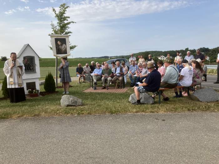 Mit dem Bus ging es nach Siegensdorf bei Ergoldsbach, dort gab es heuer nicht nur die Andacht zu Ehren des Hl. Aloisius von Gonzaga zu feiern, die Namens-Freunde von dort hatten sich eine Fahne erstellen lassen, um deren Segnung es ebenso ging. Die Haager Aloisen beiderlei Geschlechts sind dort schon lange keine Gelegenheitsbesucher mehr, zahlreiche Besuch dort, beim Hl. Aloisius-Marterl, und im Schützenheim- wo es immer eine Brotzeit gibt, haben diese Treffen zur Tradition erhoben, was sich auch gesellschaftlich niederschlägt.