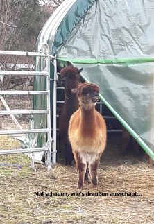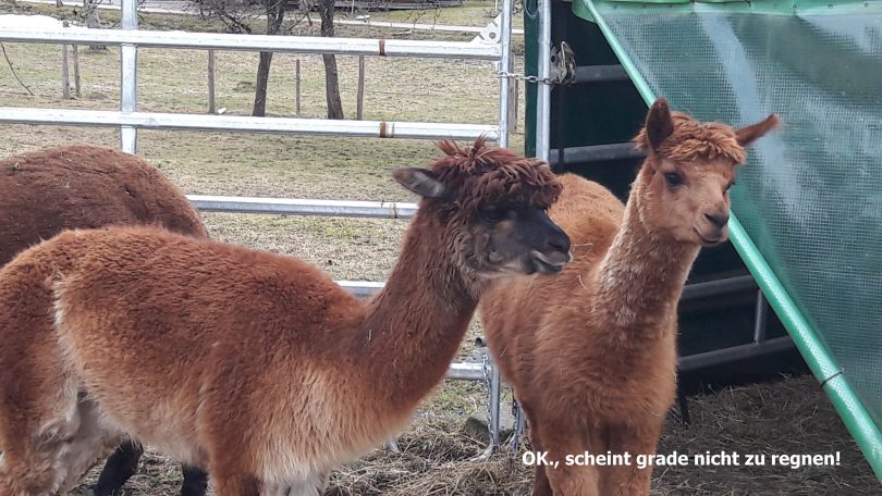 Nur wenige Leute zog es am heutigen ersten Fastensonntag aus den warmen Stuben ob des windigen, zuweilen stürmischen Wetters. Ganz anders diese Alpakas in Grainbach auf dem Samerberg nahe dem Gasthaus Alpenrose. Diese haben natürlich auch ein dickeres Fell. Die in Peru besonders stark beheimateten Tiere werden in erster Linie wegen ihres wertvollen Fells gezüchtet.