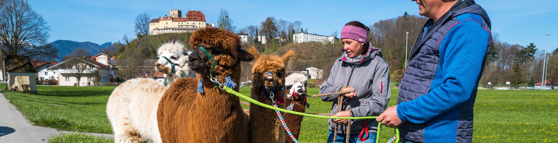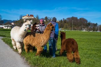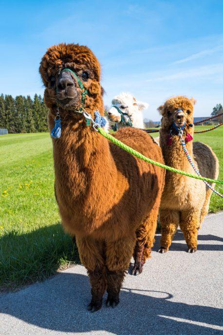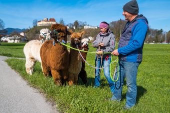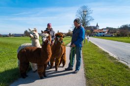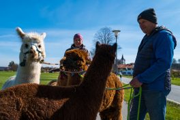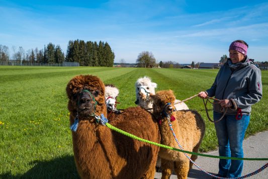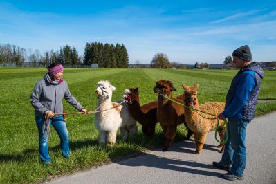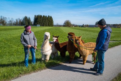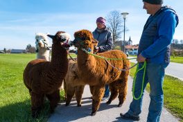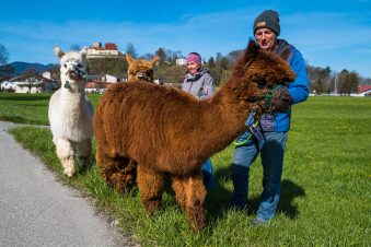 In Neubeuern gehen Angelika und Martin Fritz heute mit ihren Alapakas spazieren, schließlich wollen die Alpakas auch die Frühlingssonne genießen.