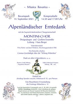 Am kommenden Sonntag, den 19. September 2021, veranstaltet des Festring München im Bavariapark einen Alpenländischen Erntedank mit der bayrisch-tirolerischen Chorgemeinschaft Montini-Chor unter der Leitung von Hans Berger. Es handelt sich hierbei um eine Benefizveranstaltung, den Reinerlös erhält die Stiftung München zur Unterstützung von Corona-Geschädigten.