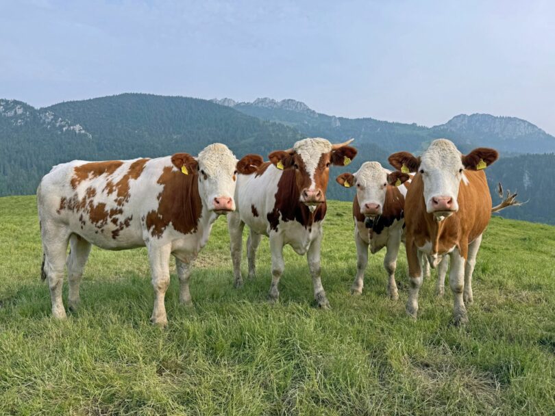 Wenn die Sonne hinter den Gipfeln versinkt und Stille über die Berge zieht, genießen auch die vierbeinigen „Almsommer-Bewohner“ die letzten warmen Strahlen des Tages. Im Kampenwandgebiet bei Aschau im Chiemgau präsentieren sich diese vier Schönheiten wie auf Bestellung – perfekt aufgereiht, ganz wie echte Fotomodels vor grandioser Naturkulisse.