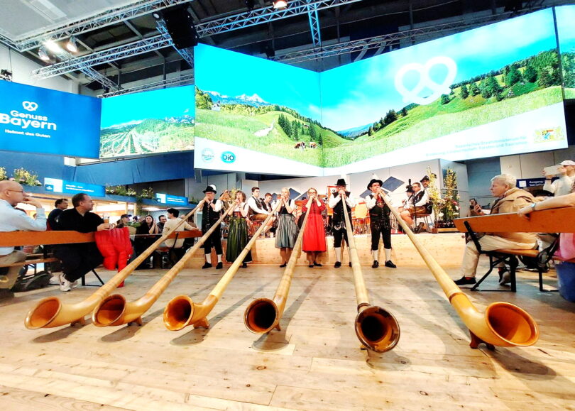 Das Alphornensemble vom Verein der Bayern in Berlin „Alphorn-Bavaria-Berlin“ war während der Internationalen Grünen Woche wieder in allen Hallen unterwegs. Bereits bei der Eröffnung der Bayernwoche im Europacenter, hat das Ensemble, zusammen mit Musikkapellen aus Bayern, die Feier mit traditionellen Alphornklängen umrahmt.