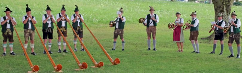 Wie schon in den letzten beiden Jahren hatten auch dieses Jahr die „Hafenstoaner Alphornbläser“ am vergangenen Donnerstag wieder zu einem Konzert eingeladen und fast 150 begeisterte Gäste bei traumhaften sommerlichen Bedingungen in den Bernauer Kurpark gelockt. Das fünfstimmige Ensemble unter der Leitung von Donat Frey gab an diesem Abend, der unter dem Motto „Vom Jodler bis zur Polka“ stand, einen Querschnitt aus seinem Repertoire, mit dabei einige neu erlernte Stücke. In seinen Moderationen erzählte Frey kurze Geschichten, wie es zum Alphornspiel in Bernau kam und beschrieb als langjähriger Alphornbauer sehr genau den Aufbau und die Entstehung des ca. vier Meter langen aus Fichtenholz geschnitzten Instruments. Da keine Ventile oder Klappen vorhanden seien, mit denen man mehr Töne produzieren könnte, kann der Spieler nur etwa 15 unterschiedliche Töne, die sog. Naturtöne, erzeugen. Aus diesem Grund kommt es zu der für Alphörner charakteristische Mehrstimmigkeit, Lieder mit bekannten Melodie zum Mitsingen sind aber meist nicht spielbar. Und so erklangen dann in munterer Folge und bei bester Intonation verschiedene Alphornrufe, Jodler und Polkas oder eine kleine musikalische Szene einer Wallfahrt. Als Zuhörer konnte man richtig spüren, mit welcher Freude und Hingabe die fünf Musikanten bei der Sache waren.