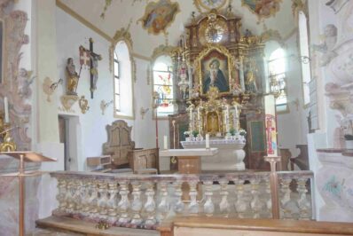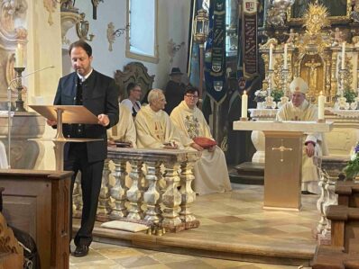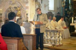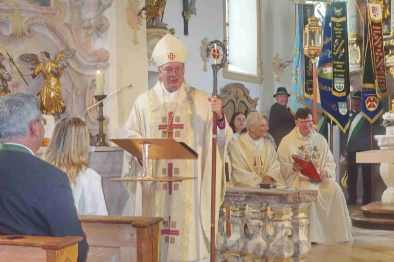 Für den Festgottesdienst mit Altarweihe konnte Weihbischof Graf zu Stolberg vom Erzbistum München-Freising gewonnen werden. Er sagte eingangs und nach dem feierlichen Einzug mit dem Liturgischen Dienst: „Die Weihe eines neuen Altares ist etwas Besonders, gerade in dieser Kirche, deren Bestehen seit über eintausend Jahren nachgewiesen ist. Ein Altar macht Jahrhunderte lang seinen Dienst, seine Segnung erinnert uns an die eigene Taufe“. Diese Segnung wurde dann im Laufe des Gottesdienstes in drei Schritten vollzogen. Zuerst mit dem Besprengen des Weihwassers, dann mit dem Einreiben durch Chrisam-Salbe und dann durch das Verbrennen von Weihrauch an fünf Stellen, die die fünf Wundmale Jesu symbolisierten. „Hier handelt es sich um uralte Riten, sie gehen zurück auf die Zeit nach der Sintflut sowie an die Handlungen und Überlieferungen von Noah, Abraham und Moses und sie wurden hinübergeführt vom Zeitalter des Alten Testaments in die Zeit des Neuen Testaments. „Der Mensch lebt in Raum und Zeit, Jesus Gegenwart ist aber eine größere Dimension. Nehmen wir deshalb die sonntägliche Eucharistiefeier zum Anlass, das, was wir in dieser an Erleuchtung und Erleichterung erfahren haben, mit in den Alltag hineinzunehmen, dann ist die Eucharistiefeier auch eine Kraftquelle. Wenn wir aber Gott und Geist beim Verlassen der Kirche wieder vergessen, dann können wir uns den Besuch der Eucharistiefeier schenken“ – so der Weihbischof, der noch sagte, dass Gott auch bei Schicksalsschlägen an der Seite der Gläubigen steht und diesen beim Tragen schwerer Last zu Hilfe kommt.