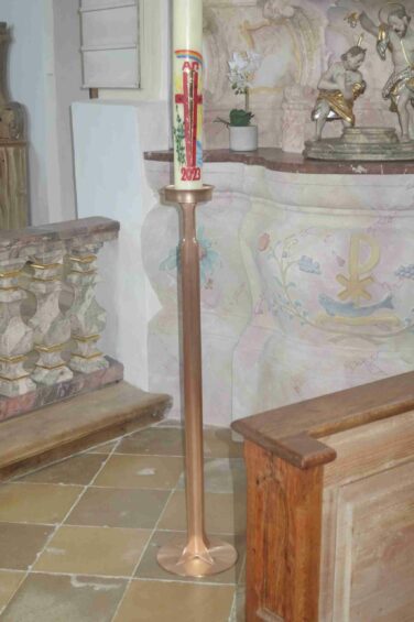 Im Rahmen der vom Ordinariat genehmigten Kirchenrenovierung gab es auch die Auflage, den Altarraum liturgisch neu zu gestalten. Hierfür konnten die Verantwortlichen des Pfarrverbandes Riedering den 2019 verstorbenen Rosenheimer Bildhauer Josef Hamberger gewinnen, der damit sein letztes Werk entworfen hat. Dass der von ihm gewünschte Schmied Marinus Singer wenige Tage nach Hambergers Tod verunglückt ist, war und ist besonders tragisch. Das Werk wunderbar vollendet hatte dann Kunstschmied Walter Ruedorfer mit seinem gleichnamigen Sohn. Ruedorfer senior arbeitete schon lange mit Herrn Hamberger zusammen, so dass die Vollendung auch dessen Vorstellungen entsprach. Zusammen mit dem Altar wurden auch das Ambo und der Leuchter für die Osterkerze nach den Plänen von Josef Hamberger gefertigt und vom Weihbischof gesegnet. Dazu sagte bei seinen Dankesworten Bürgermeister Christoph Vodermaier: „Die Wallfahrtskirche Maria-Stern ist weit über die Gemeindegrenzen von Riedering hinaus bekannt und ein wichtiges Ziel für die Gläubigen unserer Gemeinde wie auch für Wallfahrer aus Nah und Fern. Für an Kunst und Kirchengeschichte interessierte Personen stellt sie mit ihrer Strahlkraft eine wertvolle Sehenswürdigkeit dar. Und durch diesen so stimmigen, unaufdringlichen und ebenso brillanten Entwurf von Volksaltar, Leuchter und Ambo erfährt unser Kirchenraum eine großartige Bereicherung zu den zahlreichen historischen Votivtafeln und dem über 300 Jahre altem Gnadenbild der Mutter Gottes hinzu“.