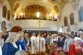 Nach der Altarsegnung dankte Kirchenpfleger Heinrich Dhom den vielen Kräften, die zur Verherrlichung der Wallfahrtskirche Maria Stern beigetragen haben. Den größten Dank aber bekam der Kirchenpfleger selbst, dazu sagte der Bürgermeister: „Im Namen der Gemeinde Riedering und als Mitglied der Kirchenverwaltung danke ich Dir für Deinen außerordentlich wertvollen Einsatz. Du hast dieses große Projekt in die Hand genommen, warst fast 10 Jahre lang in ständigem Austausch mit Architekten, Gutachtern, Historikern, Künstlern und Facharbeitern und hast die Bauarbeiten und den Baufortschritt engmaschig überwacht“. Es folgten starker, langanhaltender und ehrlicher Applaus für den Kirchenpfleger und ein Geschenk für einen Kulinarischen Genuss. Die musikalische Gestaltung der Eucharistiefeier lag in besten Händen beim Kirchenchor unter der Leitung von Barbara Zellner-Ngom sowie bei den Riederinger Weisenblässern unter der Leitung von Sepp Staber junior. Den Altarraum verschönerten mit ihrer Anwesenheit die für Ortsvereine von Neukirchen mit ihren Fahnenabordnungen. Bei der Feier des Gottesdienstes wurde Weihbischof Graf zu Stolberg unterstützt von Pfarrer Claus Kebinger, von Ruhestandspfarrer Herbert Zimmermann, von Gemeindereferent Tobias Gaiser und vom ehrenamtlichen Mesnerdienst. Als Ehrengäste konnten begrüßt werden: Florian und Margarethe Hamberger, Sohn und Tochter des Altar-Entwerfers, Dr. Peter Kern, Vorsitzender der Alfred-Delp-Stiftung und Frater Andreas Remler vom Stift Göttweig in der Wachau.