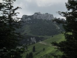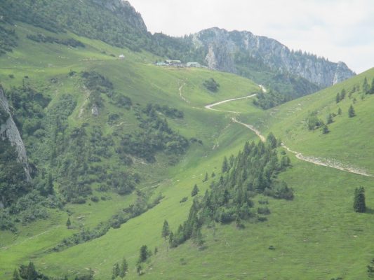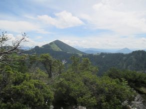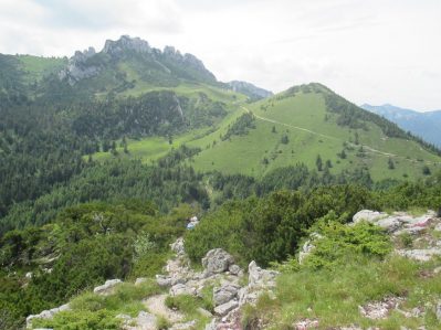 Zurück gehen wir zuerst unmarkiert ein Stück auf dem Kamm entlang, dann am Zwölferturm vorbei und kommen wieder auf einen gut erkennbaren Steig, der nach einem letzten schönen Aussichtsplatz hinunter zur Wegkreuzung “Bei Unserer Lieben Frau” führt. Jetzt gehts wieder auf dem Hauptweg hinunter zum Parkplatz, jedoch nicht ohne einen kurzen Abstecher zur Maisalm, wo eine Einkehr unvermeidlich ist.
