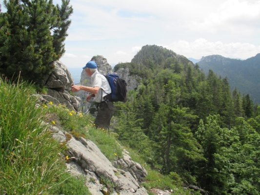 Eine interessante Alternative für trittsichere und schwindelfreie Bergsteiger ist da die Gedererwand, ein der Kampenwand von Ost nach West vorgelagerter gestreckter Felszug, der in teils lotrechten Wänden abstürzt. Im Osten begrenzt den Kamm ein wilder Felsgipfel, zwar nur 1398 m hoch, aber mit wunderbarer Aussicht. Nach Westen verliert sich der Feldzug an den Sulten hin. Die Gedererwand ist nur wenig begangen, wir trafen jedenfalls bei unserer Besteigung ab der Abzweigung “Bei Unserer liebe Frau” keinen einzigen Menschen mehr.