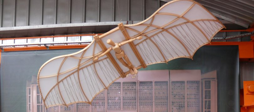 Dem genialen Erfinder wohnte der Traum vom Fliegen inne. Er beobachtete Vögel und empfand ihre Bewegungen in Form von sehr speziellen Fluggeräten nach. Nicht alles funktionierte auf Anhieb. Manches sollte erst rund 500 Jahre später von seinen Ingenieurs-Enkeln mit Leben erfüllt werden. Der Traum vom Fliegen erweckte in Leonardo eine besondere Schaffenskraft. Ausgehend von der genauen Analyse der Vogelflugbewegungen entwickelte er unterschiedliche Fluggeräte. An dessen Ende stand der Ornikopter, ein beeindruckend bewegliches Konstrukt, in dem der „Pilot“ das Gerät durch Lenkbewegungen den Winden sanft anpassen konnte. Der Meister wusste um die Macht seiner kreativen Schätze und um die Lust der Spione, diese stibitzen zu wollen. Deshalb entwickelte er eine Spiegelschrift, die außer ihm niemand lesen konnte.
