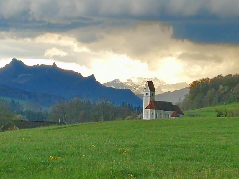 Fotos: Hötzelsperger/Antretter/Osterhammer – Eindrücke von der Wallfahrtskirche St. Florian bei Frasdorf (Gewitterstimmung im Mai, geschmückter Altar zum Patroziniums-Gottesdienst, Frühjahrsblick auf die Kampenwand und Heiliger Florian).