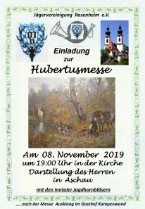 Pfarrkirche Darstellung des Herrn in Aschau: Hubertusmesse in B mit den Inntalerjagdhornbläsern am Freitag, 8. November um 19 Uhr. Die Predigt hält Pfarrer Paul Janßen. Im Anschluss ist Ausklang in der Gaststätte Kampenwand in Aschau.
